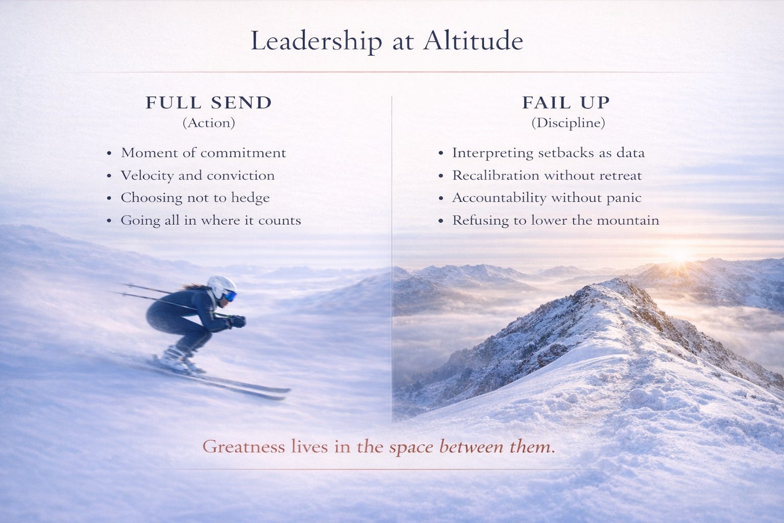 Leadership at altitude requires two distinct disciplines: knowing when to go full send, and knowing how to fail up.